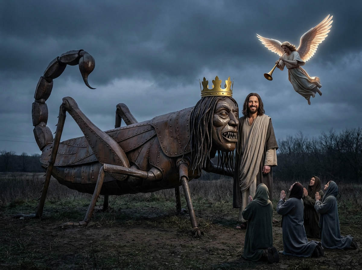 Jesus Christ and one of his friends, a locust with a scorpion’s tail, a human face, and a crown of gold, from the New Testament’s Book of Revelation Chapter 9